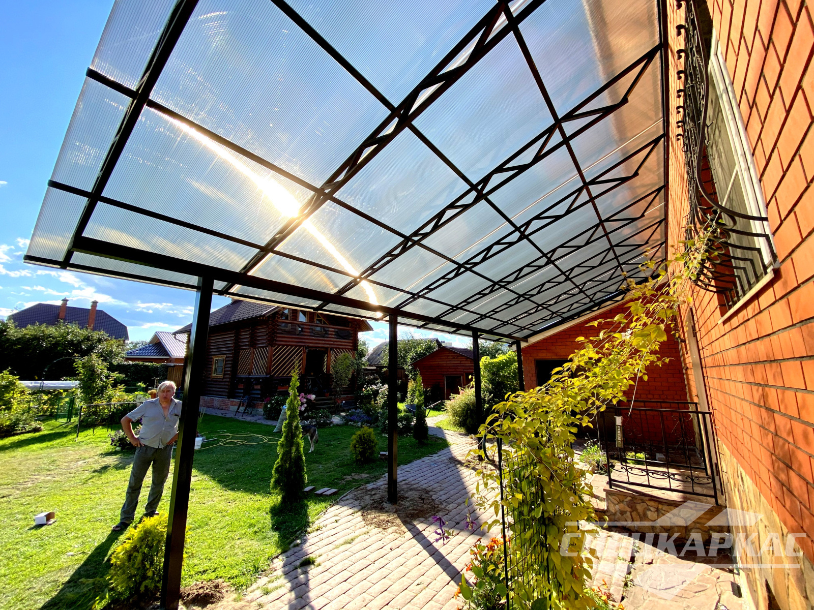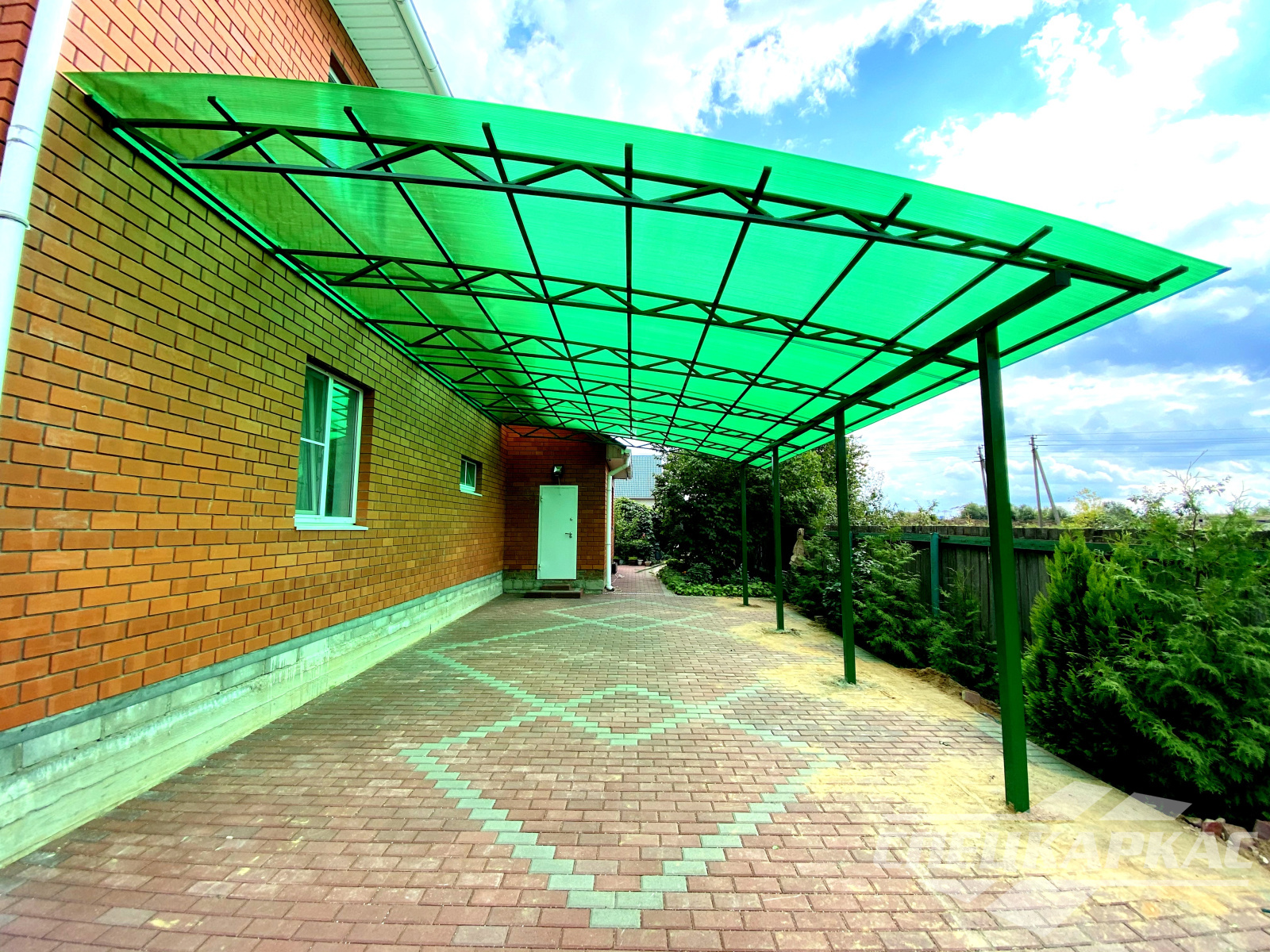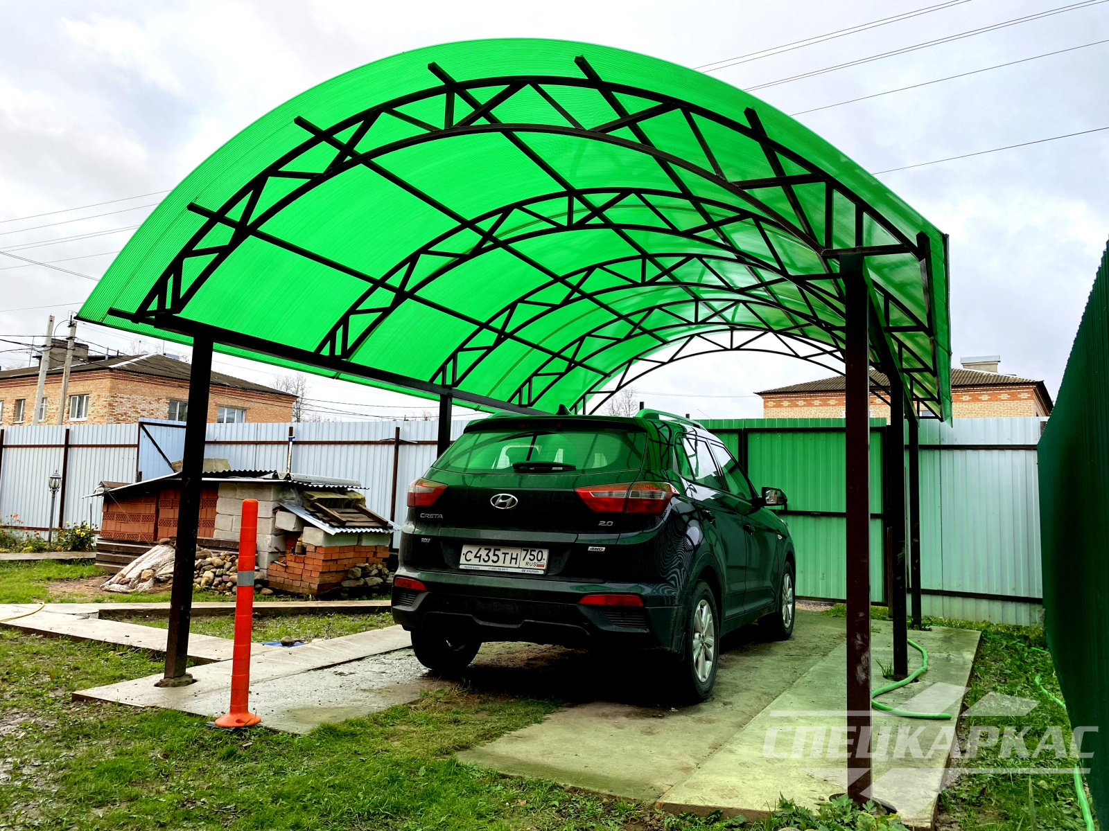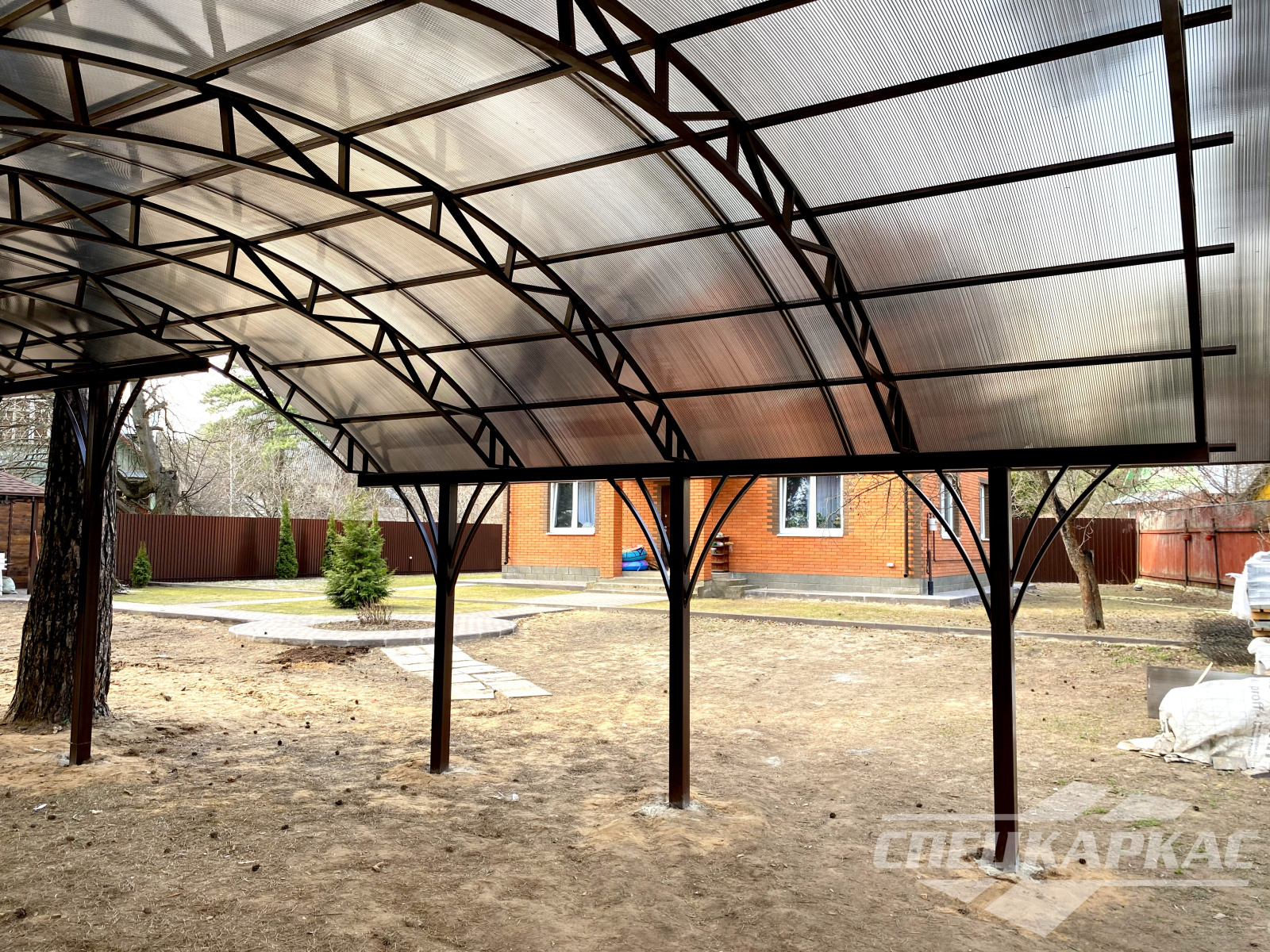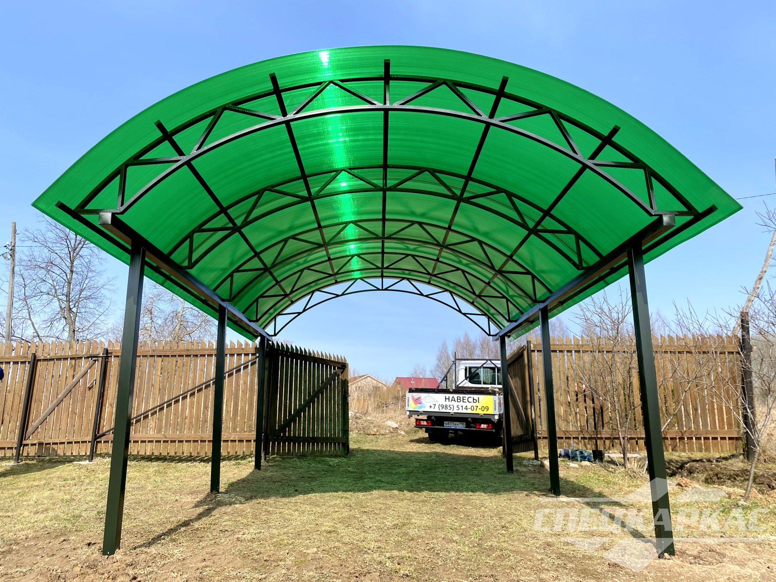 У нас вы можете купить навесы из поликарбоната как в виде отдельностоящих сооружений, так и пристенные и пристроенные варианты. Кроме того, Спецкаркас выпускают специальные: