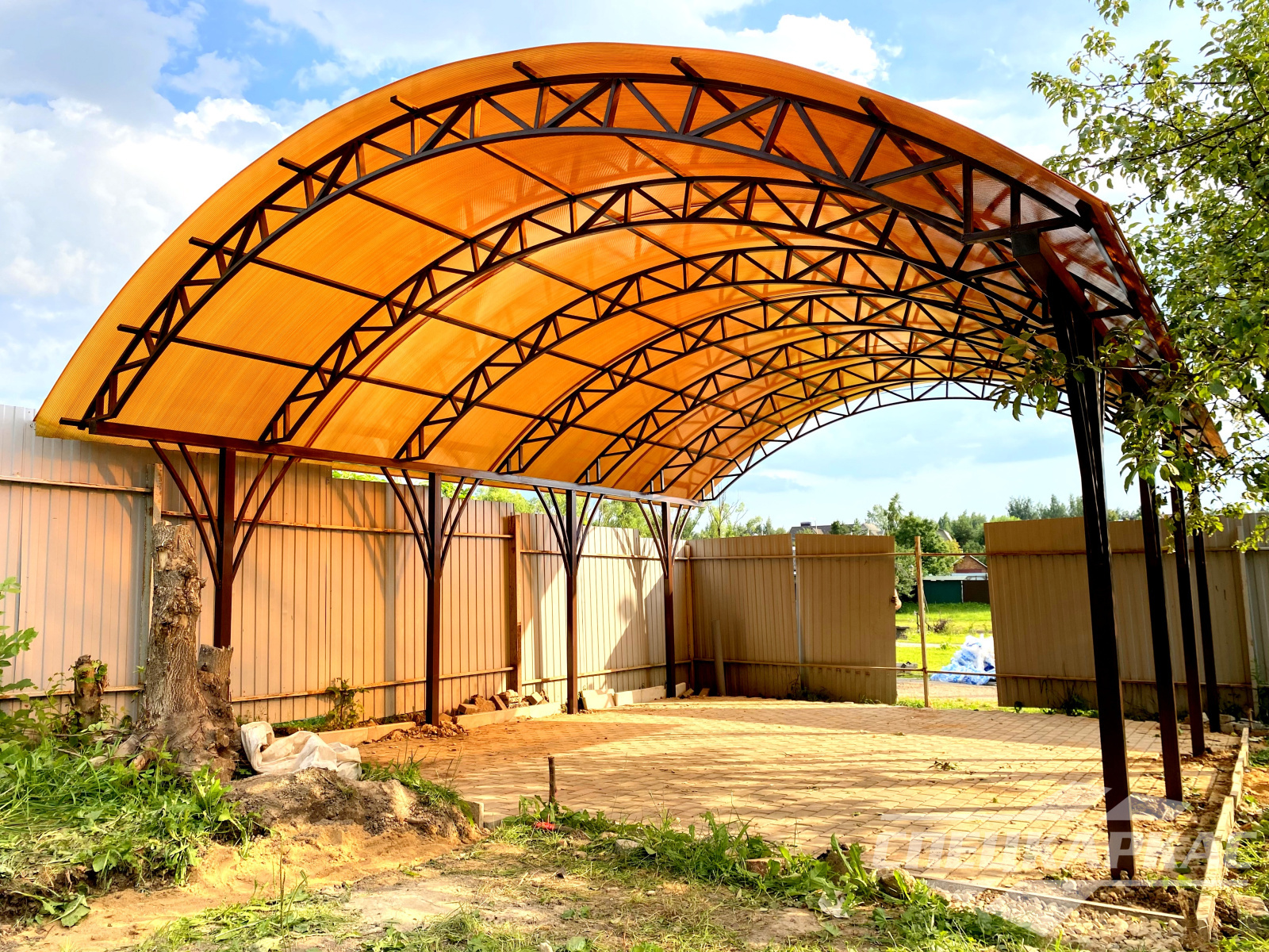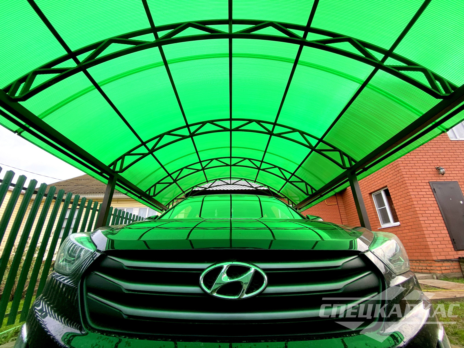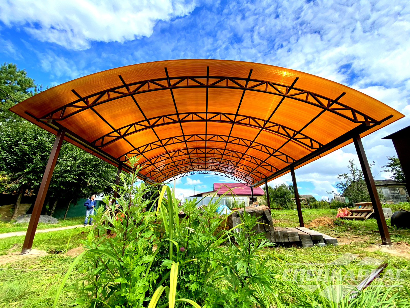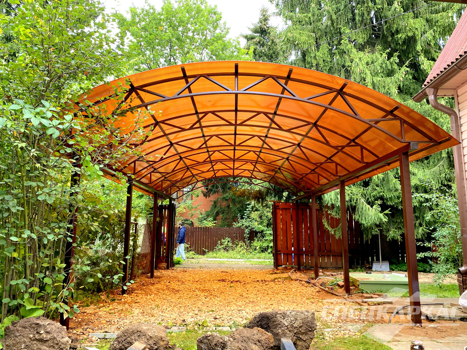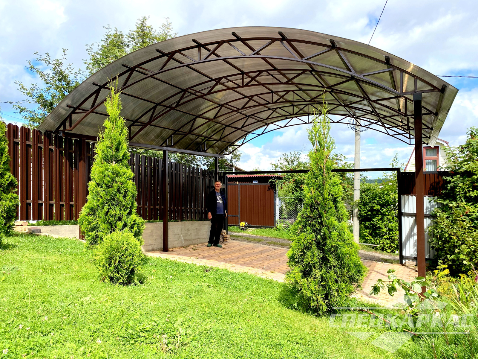 У нас вы можете купить навесы из поликарбоната как в виде отдельностоящих сооружений, так и пристенные и пристроенные варианты. Кроме того, Спецкаркас выпускают специальные: