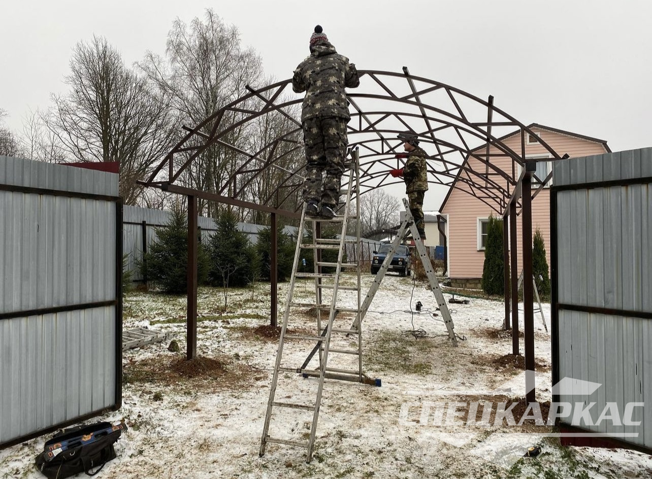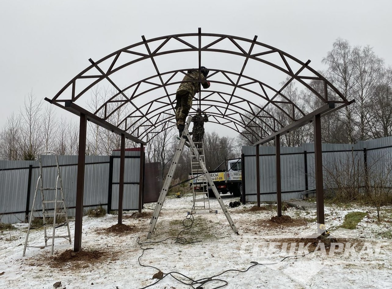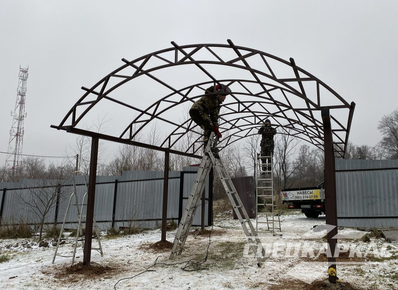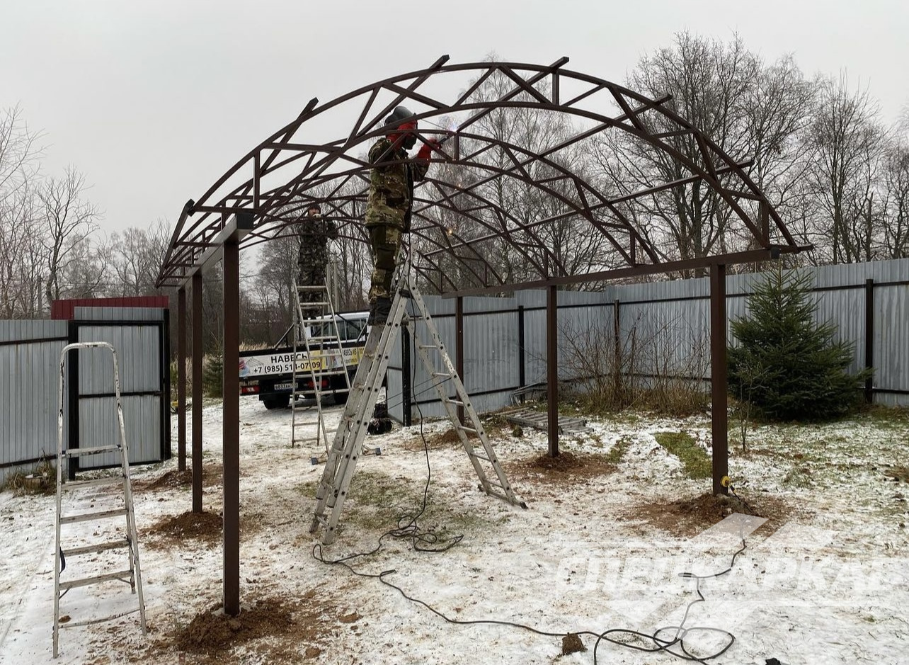 • Металлический комплект навеса  полностью подготавливается в нашей мастерской, на объекте заказчика происходит  только узловая сборка.